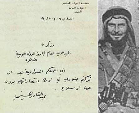 Letter from Abdul Qadi to the Secretary General of the Arab League, dated 1948: “I warn you that history will witness that you have betrayed the ummah and that you have sold Palestine. History will be merciless with likes of you. I hereby make you responsible for deserting me and my troops without aid or arms during our great victory.”